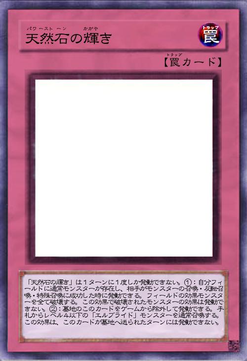 | 「天然石の輝き」は1ターンに1度しか発動できない。①:自分フィールドに通常モンスターが存在し、相手がモンスターの召喚・反転召喚・特殊召喚に成功した時に発動できる。フィールドの効果モンスターを全て破壊する。この効果で破壊されたモンスターの効果は発動できない。②:墓地のこのカードをゲームから除外して発動できる。手札からレベル4以下の「エルブライド」モンスターを通常召喚する。この効果は、このカードが墓地へ送られたターンには発動できない。 | |||