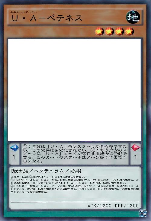 | ①:自分は「U・A」モンスターしかP召喚できない。この効果は無効化されない。②:もう片方のPゾーンに「U・A」カードが存在する場合に発動できる。このカードのスケールはターン終了時まで10になる。 | |||