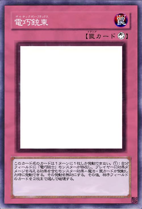 | このカード名のカードは1ターンに1枚しか発動できない。①:自分フィールドに「電巧銃士」モンスターが存在し、プレイヤーに効果ダメージを与える効果を含むモンスター効果・魔法・罠カードが発動した時に発動できる。その発動を無効にする。その後、相手フィールドのカードを2枚まで選んで破壊する。 | |||