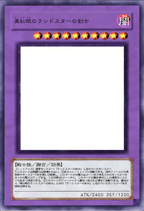 | 「レッドアイズ」通常モンスター+「ランドスターの剣士」と名のついたモンスター ①このカードは戦闘では破壊されない。②自分メインフェイズに発動できる。相手フィールドの表側表示モンスター1体を選んで破壊し、このカードの攻撃力はターン終了時までそのモンスターの元々の攻撃力分アップする。この効果は1ターン中に、このカードの融合素材とした通常モンスターの数まで使用できる。③このカードがフィールドから墓地へ送られた場合に発動できる。墓地から「真紅眼のランドスターの剣士」以外の「ランドスターの剣士」と名のついたモンスター1体を特殊召喚する。 | |||