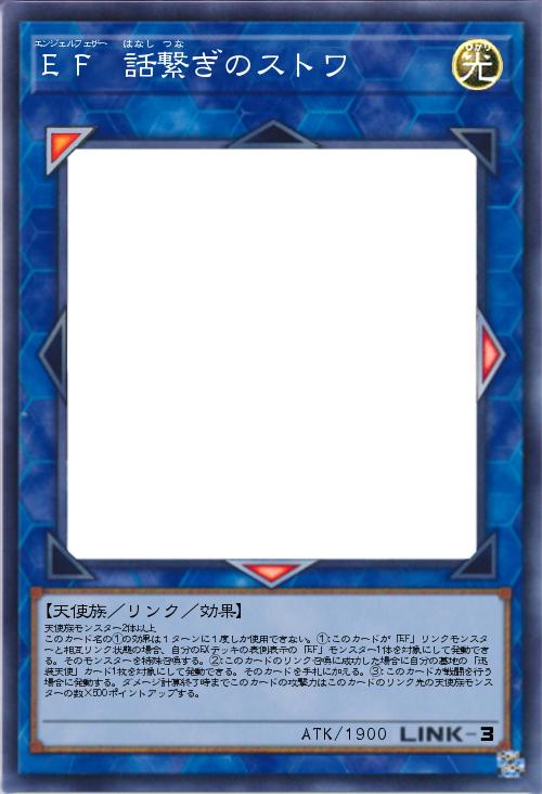 | 天使族モンスター2体以上 このカード名の①の効果は1ターンに1度しか使用できない。①:このカードが「EF」リンクモンスターと相互リンク状態の場合、自分のEXデッキの表側表示の「EF」モンスター1体を対象にして発動できる。そのモンスターを特殊召喚する。②:このカードのリンク召喚に成功した場合に自分の墓地の「迅装天使」カード1枚を対象にして発動できる。そのカードを手札に加える。③:このカードが戦闘を行う場合に発動する。ダメージ計算終了時までこのカードの攻撃力はこのカードのリンク先の天使族モンスターの数×500ポイントアップする。 | |||
