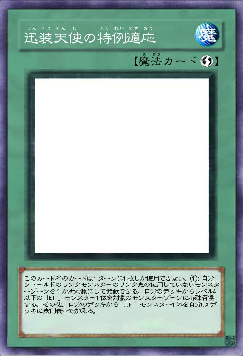 | このカード名のカードは1ターンに1枚しか使用できない。①:自分フィールドのリンクモンスターのリンク先の使用していないモンスターゾーンを1か所対象にして発動できる。自分のデッキからレベル4以下の「EF」モンスター1体を対象のモンスターゾーンに特殊召喚する。その後、自分のデッキから「EF」モンスター1体を自分EXデッキに表側表示で加える。 | |||