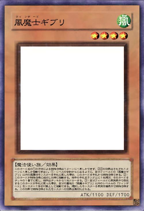 | このカード名の①の方法による特殊召喚は1ターンに1度しかできず、②③の効果はそれぞれ1ターンに1度しか発動できない。①:レベルの合計が4になるように、自分フィールドの「風魔士ギブリ」以外の風属性モンスターを手札に戻した場合、このカードを手札から特殊召喚できる。②:このカードが特殊召喚に成功した時に発動する。相手の手札をランダムに1枚選び、そのカードをデッキの1番下に戻し、相手はデッキから1枚ドローする。③:自分フィールドに表側表示で存在するこのカードが手札に戻った場合、自分の墓地の「風魔士ギブリ」以外のレベル4の「ウィンザード」モンスター1体を対象として発動できる。選択したモンスターを表側守備表示で特殊召喚する。この効果で特殊召喚されたモンスターの効果は無効化される。 | |||