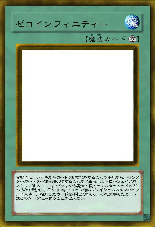 | 発動時に、デッキからカードを5枚除外することで手札から、モンスターカードを一体特殊召喚することが出来る。次ドローフェイズをスキップすることで。デッキから魔法・罠・モンスターカードのどちらかを選択し、除外する。3ターン後のプレイヤーのスタンバイフェイズ時に、除外したカードを手札に加える。手札に加えたカードはこのターン使用することが出来ない。 | |||