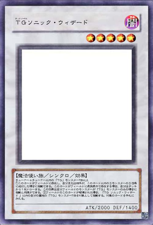 | チューナー+チューナー以外の「TG」モンスター1体以上 ①このカードがフィールドに存在し、自分または相手が、このカード以外のSモンスターのS召喚に成功した場合に発動できる。このカードがフィールドに表側表示で存在する場合、自分はデッキから1枚ドローする。この効果は自分フィールドのモンスターが「TG」モンスターのみの場合に発動と処理ができる。②フィールドのこのカードが破壊された場合、「TG ソニック・ウィザード 」以外の自分の墓地の「TG」モンスター1体を対象として発動する。対象のカードを手札に加える。 | |||
