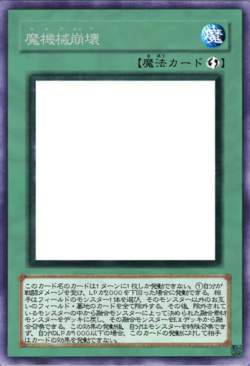 | このカード名のカードは1ターンに1枚しか発動できない。①自分が戦闘ダメージを受け、LPが2000を下回った場合に発動できる。相手はフィールドのモンスター1体を選び、そのモンスター以外のお互いのフィールド・墓地のカードを全て除外する。その後、除外されているモンスターの中から融合モンスターによって決められた融合素材モンスターをデッキに戻し、その融合モンスターをEXデッキから融合召喚できる。この効果の発動後、自分はモンスターを特殊召喚できず、自分のLPが1000以下の場合、このカードの発動に対して相手はカードの効果を発動できない。 | |||