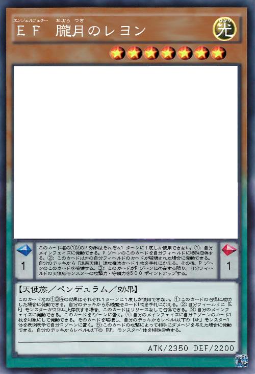 | このカード名の①③④の効果はそれぞれ1ターンに1度しか使用できない。①:このカードの召喚に成功した場合に発動できる。自分のデッキから永続魔法カード1枚を手札に加える。②:自分フィールドに「EF」モンスターが2体以上存在する場合、このカードはリリースなして召喚できる。③:自分のメインフェイズに発動できる。このカードをPゾーンに置く。④:自分のメインフェイズに自分Pゾーンのカード1枚を対象にして発動できる。そのカードを破壊し、自分のデッキからレベル4以下の「EF」モンスター1体を表側表示で自分Pゾーンに置く。⑤:このカードの攻撃によって相手にダメージを与えた場合に発動できる。自分のデッキからレベル4以下の「EF」モンスター1体を特殊召喚する。 | |||