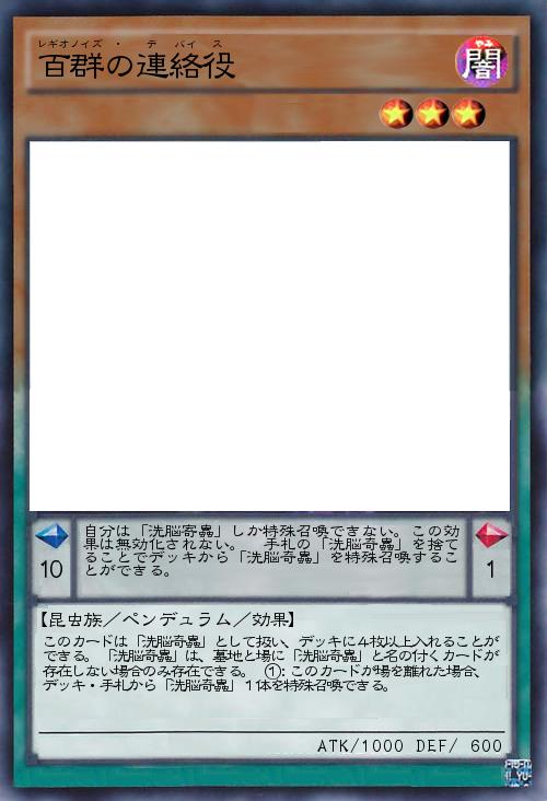 | 自分は「洗脳寄蟲」しか特殊召喚できない。この効果は無効化されない。 手札の「洗脳奇蟲」を捨てることでデッキから「洗脳奇蟲」を特殊召喚することができる。 | |||