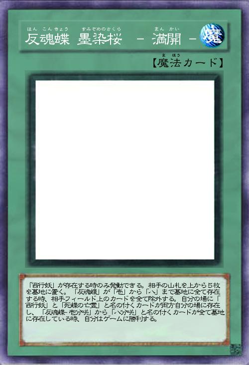 | 「西行妖」が存在する時のみ発動できる。相手の山札を上から5枚を墓地に置く。「反魂蝶」が「壱」から「八」まで墓地に全て存在する時、相手フィールド上のカードを全て除外する。自分の場に「西行妖」と「死蝶の亡霊」と名の付くカードが両方自分の場に存在し、「反魂蝶-壱分咲」から「八分咲」と名の付くカードが全て墓地に存在している時、自分はゲームに勝利する。 | |||
