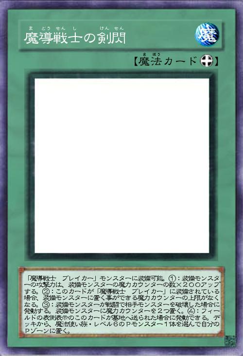 | 「魔導戦士 ブレイカー」モンスターに装備可能。①:装備モンスターの攻撃力は、装備モンスターの魔力カウンターの数×200アップする。②:このカードが「魔導戦士 ブレイカー」に装備されている場合、装備モンスターに置く事ができる魔力カウンターの上限がなくなる。③:装備モンスターが戦闘で相手モンスターを破壊した場合に発動する。装備モンスターに魔力カウンターを2つ置く。④:フィールドの表側表示のこのカードが墓地へ送られた場合に発動できる。デッキから、魔法使い族・レベル6のPモンスター1体を選んで自分のPゾーンに置く。 | |||