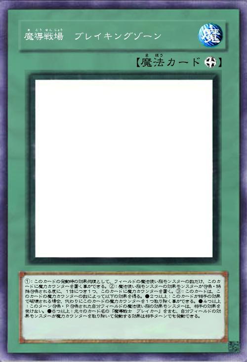 | ①:このカードの発動時の効果処理として、フィールドの魔法使い族モンスターの数だけ、このカードに魔力カウンターを置く事ができる。②:魔法使い族モンスターの効果モンスターが召喚・特殊召喚される度に、1体につき1つ、このカードに魔力カウンターを置く。③:このカードは、このカードの魔力カウンターの数によって以下の効果を得る。●2つ以上:このカードが相手の効果で破壊される場合、代わりにこのカードの魔力カウンターを1つ取り除く事ができる。●4つ以上:このターン召喚・P召喚された自分フィールドの魔法使い族の効果モンスターは、相手の効果を受けない。●6つ以上:元々のカード名の「魔導戦士 ブレイカー」を含む、自分フィールドの効果モンスターが魔力カウンターを取り除いて発動する効果は相手ターンでも発動できる。 | |||