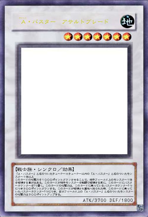 「A・バスター」と名のついたチューナー+チューナー以外の「A・バスター」と名のついたモンスター1体以上 このカードの攻撃力を1000ポイントダウンさせることで、相手フィールド上のモンスター1体を破壊する事が出来る。このカードが相手モンスターを戦闘で破壊する度に、このカードにバスターカウンターを1つ置く。このカードの攻撃力は、このカードに乗っているバスターカウンター1つにつき300ポイントダウンする。このカードが破壊され墓地へ送られた時、このカードに乗っていたバスターカウンター1つにつき、自分フィールド上の「A・バスター」と名のついたモンスターの攻撃力は300ポイントアップする。 |