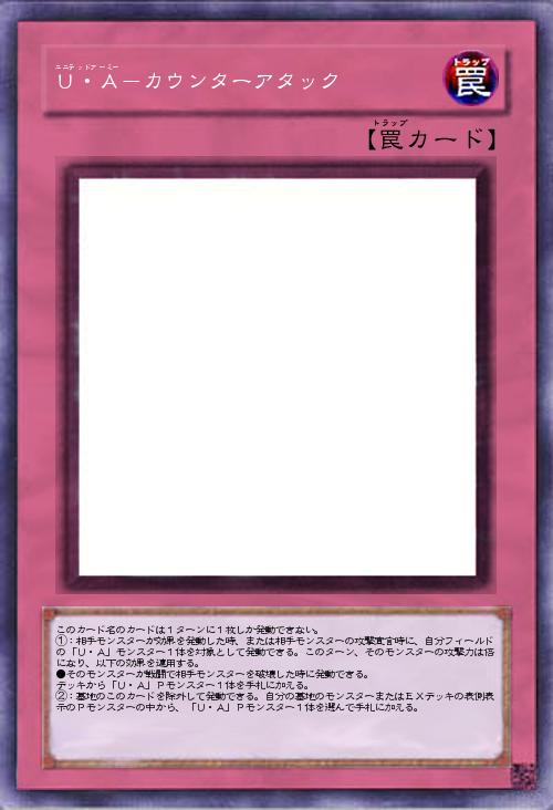 | このカード名のカードは1ターンに1枚しか発動できない。 ①:相手モンスターが効果を発動した時、または相手モンスターの攻撃宣言時に、自分フィールドの「U・A」モンスター1体を対象として発動できる。このターン、そのモンスターの攻撃力は倍になり、以下の効果を適用する。 ●そのモンスターが戦闘で相手モンスターを破壊した時に発動できる。 デッキから「U・A」Pモンスター1体を手札に加える。 ②:墓地のこのカードを除外して発動できる。自分の墓地のモンスターまたはEXデッキの表側表示のPモンスターの中から、「U・A」Pモンスター1体を選んで手札に加える。 | |||