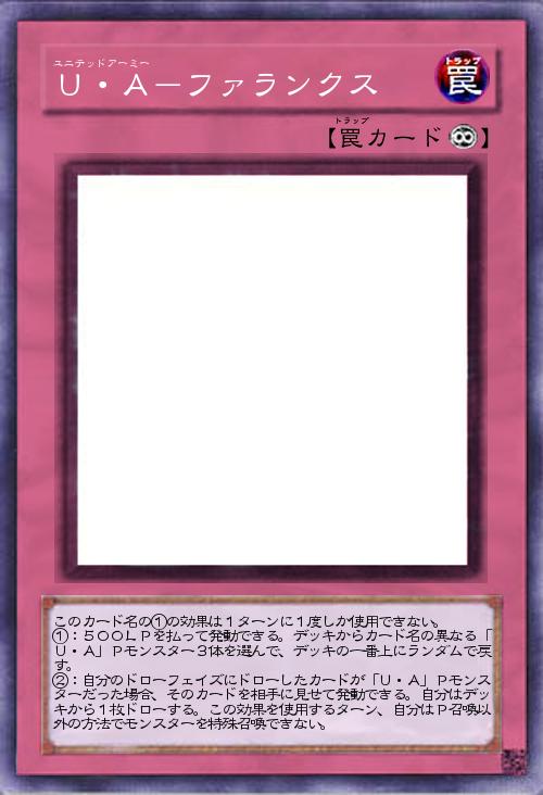 | このカード名の①の効果は1ターンに1度しか使用できない。 ①:500LPを払って発動できる。デッキからカード名の異なる「U・A」Pモンスター3体を選んで、デッキの一番上にランダムで戻す。 ②:自分のドローフェイズにドローしたカードが「U・A」Pモンスターだった場合、そのカードを相手に見せて発動できる。自分はデッキから1枚ドローする。この効果を使用するターン、自分はP召喚以外の方法でモンスターを特殊召喚できない。 | |||