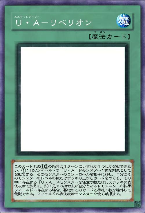 | このカード名の①②の効果は1ターンにいずれか1つしか発動できない。①:自分フィールドの「U・A」Pモンスター1体を対象として発動できる。そのモンスターのコントロールを相手に移し、自分はそのモンスターのレベルの数だけデッキの上からカードをめくり、その中に存在する「U・A」Pモンスターを任意の数だけEXデッキに表側表示で加える。②:元々の持ち主が自分となるPモンスターが相手フィールドに存在する場合、墓地のこのカードと手札1枚を除外して発動できる。フィールドの表側表示モンスターを全て破壊する。 | |||