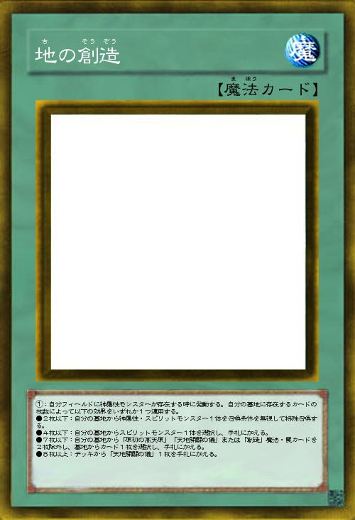 | ①:自分フィールドに神属性モンスターが存在する時に発動する。自分の墓地に存在するカードの枚数によって以下の効果をいずれか1つ適用する。 ●2枚以下:自分の墓地から神属性・スピリットモンスター1体を召喚条件を無視して特殊召喚する。 ●4枚以下:自分の墓地からスピリットモンスター1体を選択し、手札に加える。 ●7枚以下:自分の墓地から「原初の高天原」「天地開闢の儀」または「創造」魔法・罠カードを2枚除外し、墓地からカード1枚を選択し、手札に加える。 ●8枚以上:デッキから「天地開闢の儀」1枚を手札に加える。 | |||