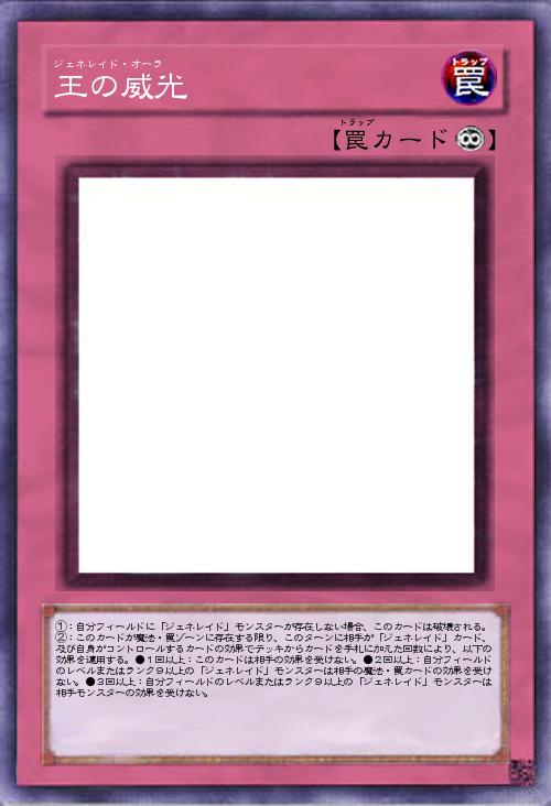 | ①:自分フィールドに「ジェネレイド」モンスターが存在しない場合、このカードは破壊される。②:このカードが魔法・罠ゾーンに存在する限り、このターンに相手が「ジェネレイド」カード、及び自身がコントロールするカードの効果でデッキからカードを手札に加えた回数により、以下の効果を適用する。●1回以上:このカードは相手の効果を受けない。●2回以上:自分フィールドのレベルまたはランク9以上の「ジェネレイド」モンスターは相手の魔法・罠カードの効果を受けない。●3回以上:自分フィールドのレベルまたはランク9以上の「ジェネレイド」モンスターは相手モンスターの効果を受けない。 | |||