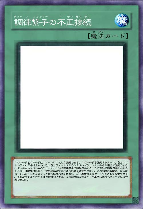 | このカード名のカードは1ターンに1枚しか発動できず、このカードを発動するターン、自分はバトルフェイズを行えない。①:自分フィールドのモンスターがチューナーのみの場合に発動できる。デッキからレベル4のチューナー1体を守備表示で特殊召喚する。この効果で特殊召喚されたモンスターは闇属性になり、効果は無効化され表示形式を変更できない。この効果の発動後、自分はSモンスターしかEXデッキから特殊召喚できない。②:墓地のこのカードを除外して発動できる。手札からチューナー1体を特殊召喚する。この効果はこのカードが墓地に送られたターンには発動できない。 | |||