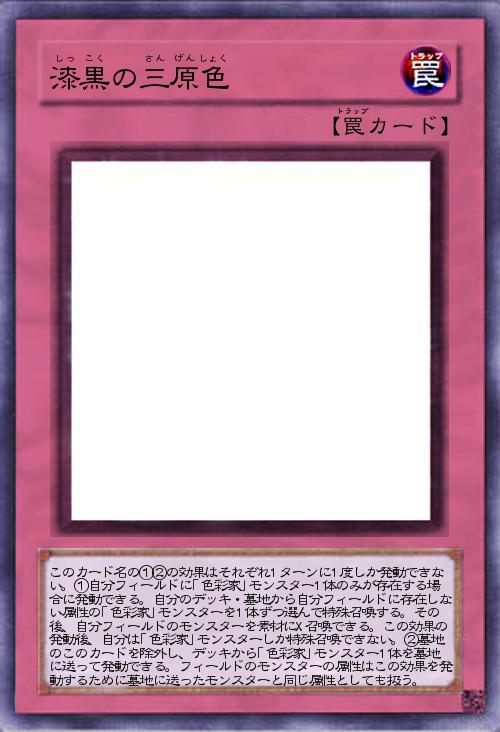 | このカード名の①②の効果はそれぞれ1ターンに1度しか発動できない。①自分フィールドに「色彩家」モンスター1体のみが存在する場合に発動できる。自分のデッキ・墓地から自分フィールドに存在しない属性の「色彩家」モンスターを1体ずつ選んで特殊召喚する。その後、自分フィールドのモンスターを素材にX召喚できる。この効果の発動後、自分は「色彩家」モンスターしか特殊召喚できない。②墓地のこのカードを除外し、デッキから「色彩家」モンスター1体を墓地に送って発動できる。フィールドのモンスターの属性はこの効果を発動するために墓地に送ったモンスターと同じ属性としても扱う。 | |||