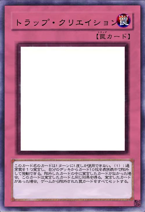 | このカード名のカードは1ターンに1度しか使用できない。(1):通常罠を1つ宣言し、自分のデッキからカード10枚を表側表示で除外して発動できる。除外したカードの中に宣言したカードがなかった場合、このカードは宣言したカードと同じ効果を得る。宣言したカードがあった場合、ゲームから除外された罠カードをすべてセットする。 | |||