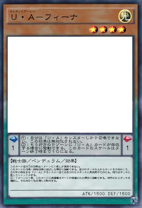 | このカード名の①の効果は1ターンに1度しか使用できない。 このカードの召喚・特殊召喚に成功した場合に発動できる。自分のデッキの上からカードを3枚めくり、その中に存在する「U・A」Pモンスター全てを自分のEXデッキに表側表示で加える。残りはデッキに戻してシャッフルする。 ②:1ターンに1度、このカードに装備魔法カードが装備された場合に発動できる。相手のEXデッキを確認し、その内の1枚を選んで除外する。 | |||