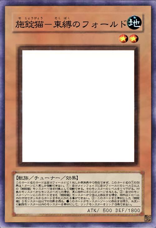 | このカード名のカードは自分フィールドに1枚しか表側表示で存在できず、このカード名の①の効果は1ターンに1度しか発動できない。①:自分メインフェイズに自分フィールドのレベル2以上の「施錠猫」モンスター1体を対象として発動できる。そのモンスターのレベルを1つ下げる。対象のモンスターがSモンスターだった場合、更に相手に500ダメージを与える。②:自分のモンスターゾーンにこのカードを含む「施錠猫」モンスターが2体以上存在する場合、相手はドロー以外の方法でデッキからカードを手札に加える事ができない。③:このカードをS素材とした「施錠猫」Sモンスターは以下の効果を得る。●このカードがモンスターゾーンに存在する限り、お互いに獣族モンスター以外のモンスターを素材にして、リンクモンスターをリンク召喚できない。 | |||