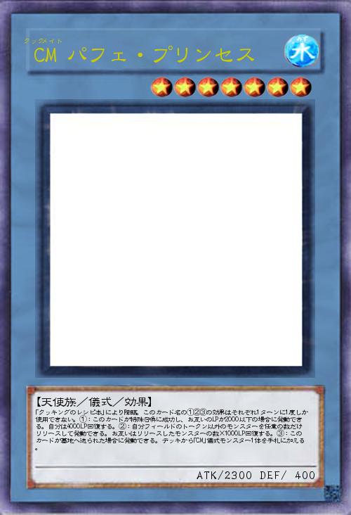 | 「クッキングのレシピ本」により降臨。このカード名の①②③の効果はそれぞれ1ターンに1度しか使用できない。①:このカードが特殊召喚に成功し、お互いのLPが2000以下の場合に発動できる。自分は4000LP回復する。②:自分フィールドのトークン以外のモンスターを任意の数だけリリースして発動できる。お互いはリリースしたモンスターの数×1000LP回復する。③:このカードが墓地へ送られた場合に発動できる。デッキから「CM」儀式モンスター1体を手札に加える。 | |||