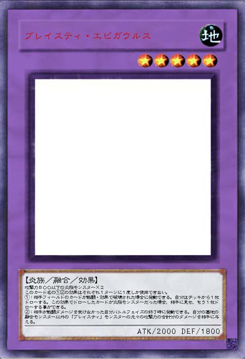 | 攻撃力500以下の炎族モンスター×2 このカード名の①②の効果はそれぞれ1ターンに1度しか使用できない。 ①:相手フィールドのカードが戦闘・効果で破壊された場合に発動できる。自分はデッキから1枚ドローする。この効果でドローしたカードが炎族モンスターだった場合、相手に見せ、もう1枚ドローする事ができる。 ②:相手が戦闘ダメージを受けなかった自分バトルフェイズの終了時に発動できる。自分の墓地の融合モンスター以外の「ブレイスティ」モンスターの元々の攻撃力の合計分のダメージを相手に与える。 | |||