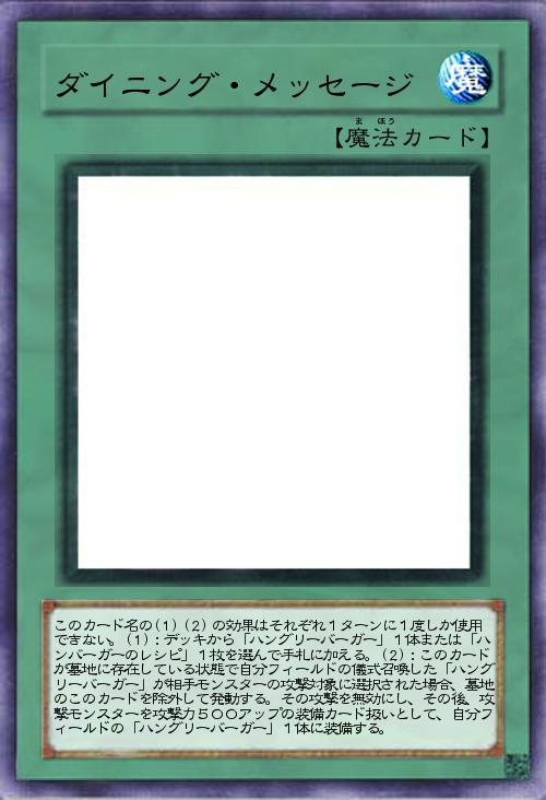 | このカード名の(1)(2)の効果はそれぞれ1ターンに1度しか使用できない。(1):デッキから「ハングリーバーガー」1体または「ハンバーガーのレシピ」1枚を選んで手札に加える。(2):このカードが墓地に存在している状態で自分フィールドの儀式召喚した「ハングリーバーガー」が相手モンスターの攻撃対象に選択された場合、墓地のこのカードを除外して発動する。その攻撃を無効にし、その後、攻撃モンスターを攻撃力500アップの装備カード扱いとして、自分フィールドの「ハングリーバーガー」1体に装備する。 | |||