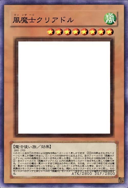 | 2900 2700 このカード名の①の方法による特殊召喚は1ターンに1度しかできず、②③の効果はそれぞれ1ターンに1度しか発動できない。①:レベルの合計が8になるように、自分フィールドの「風魔士クリアドル」以外の風属性モンスターを手札に戻した場合、このカードを手札から特殊召喚できる。②:自分フィールドの「風魔士クリアドル」以外の風属性モンスター1体を手札に戻して発動できる。フィールドの魔法・罠カードを全て持ち主の手札に戻す。その後、ターン終了時まで自分は魔法・罠カードを発動及びセットできない。③:このカードが手札に戻った場合、自分フィールドの風属性Xモンスター1体を対象として発動できる。選択したモンスターをEXデッキに戻し、そのモンスターのランクと同じレベルの「風魔士」モンスター1体をデッキから守備表示で特殊召喚する。 | |||