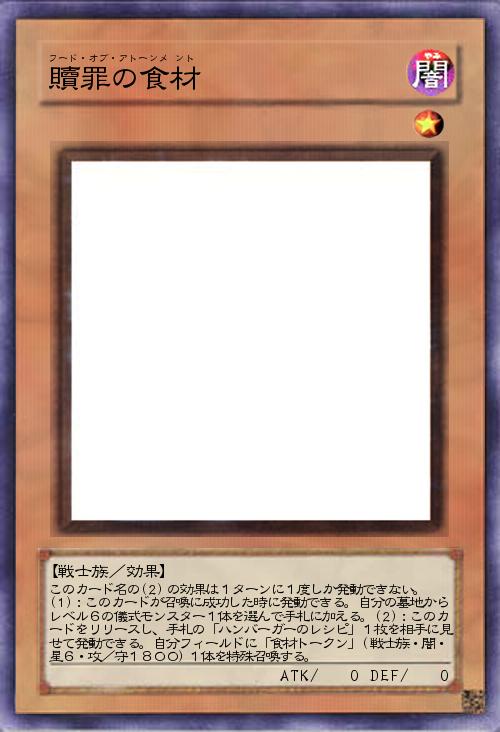 | このカード名の(2)の効果は1ターンに1度しか発動できない。 (1):このカードが召喚に成功した時に発動できる。自分の墓地からレベル6の儀式モンスター1体を選んで手札に加える。(2):このカードをリリースし、手札の「ハンバーガーのレシピ」1枚を相手に見せて発動できる。自分フィールドに「食材トークン」(戦士族・闇・星6・攻/守1800)1体を特殊召喚する。 | |||
