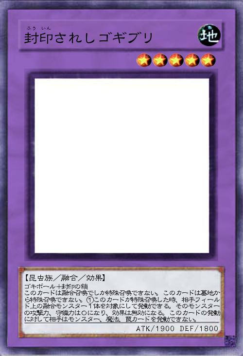 | ゴキボール+封印の鎖 このカードは融合召喚でしか特殊召喚できない。このカードは墓地から特殊召喚できない。①このカードが特殊召喚した時、相手フィールド上の融合モンスター1体を対象にして発動できる。そのモンスターの攻撃力、守備力は0になり、効果は無効になる。このカードの発動に対して相手はモンスター、魔法、罠カードを発動できない。 | |||