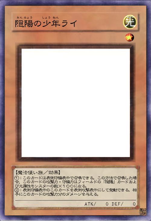 | ①:このカードは表側守備表示で召喚できる。この方法で召喚した場合、このカードの攻撃力・守備力はフィールドの「隠陽」カードおよび光属性モンスターの数×100になる。 ②:表側守備表示のこのカードを表側攻撃表示にして発動できる。相手にこのカードの攻撃力分のダメージを与える。 | |||