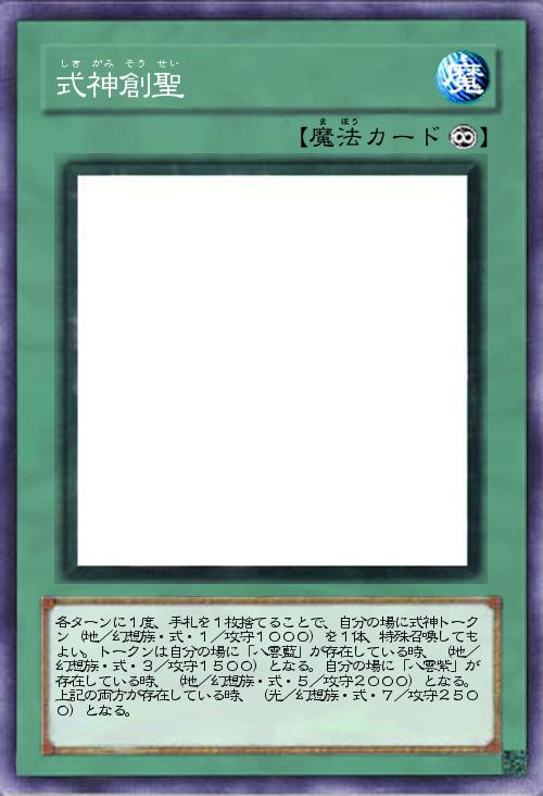 | 各ターンに1度、手札を1枚捨てることで、自分の場に式神トークン(地/幻想族・式・1/攻守1000)を1体、特殊召喚してもよい。トークンは自分の場に「八雲藍」が存在している時、(地/幻想族・式・3/攻守1500)となる。自分の場に「八雲紫」が存在している時、(地/幻想族・式・5/攻守2000)となる。上記の両方が存在している時、(光/幻想族・式・7/攻守2500)となる。 | |||