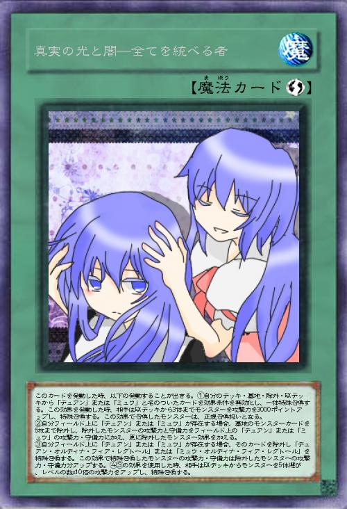 | このカードを発動した時、以下の発動することが出きる。①自分のデッキ・墓地・除外・EXデッキから「デュアン」または「ミュウ」と名のついたカードを効果条件を無効化し、一体特殊召喚する。この効果を発動した時、相手はEXデッキから3体までモンスターを攻撃力を3000ポイントアップし、特殊召喚する。この効果で召喚したモンスターは、正規召喚扱いとなる。 ②自分フィールド上に「デュアン」または「ミュウ」が存在する場合、墓地のモンスターカードを5枚まで除外し、除外したモンスターの攻撃力と守備力をフィールド上の「デュアン」または「ミュウ」の攻撃力・守備力に加え、更に除外したモンスター効果を加える。 ③自分フィールド上に「デュアン」または「ミュウ」が存在する場合、そのカードを除外し「デュアン・オルディナ・フィア・レグトール」または「ミュウ・オルディナ・フィア・レグトール」を特殊召喚する。この効果で特殊召喚した | |||