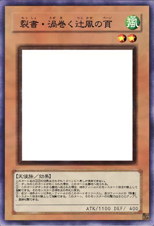 | このカード名の②③の効果はそれぞれ1ターンに1度しか使用できない。 ①:デッキのこのカードがめくられた場合、このカードは墓地へ送られる。 ②:このカードがデッキから墓地へ送られた場合、相手フィールドのモンスター1体を対象として発動できる。そのモンスターを持ち主の手札に戻す。 ③:自分・相手ターンに手札・フィールドのこのカードをリリースし、自分フィールドの「裂書」モンスター1体を対象として発動できる。このターン、そのモンスターの攻撃力は800アップし、直接攻撃できる。 | |||
