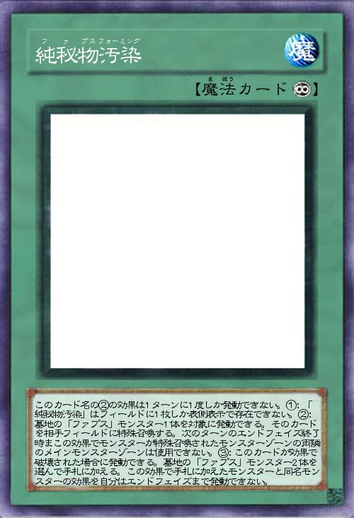 | このカード名の②の効果は1ターンに1度しか発動できない。①:「純秘物汚染」はフィールドに1枚しか表側表示で存在できない。②:墓地の「ファプス」モンスター1体を対象に発動できる。そのカードを相手フィールドに特殊召喚する。次のターンのエンドフェイズ終了時まこの効果でモンスターが特殊召喚されたモンスターゾーンの両隣のメインモンスターゾーンは使用できない。③:このカードが効果で破壊された場合に発動できる。墓地の「ファプス」モンスター2体を選んで手札に加える。この効果で手札に加えたモンスターと同名モンスターの効果を自分はエンドフェイズまで発動できない。 | |||