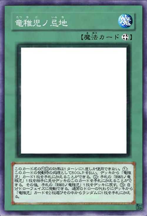 | このカード名の①②の効果は1ターンに1度しか使用できない。①:このカードの発動時の処理として800LPを払い、デッキから「竜稚児」カード1枚を手札に加えることができる。②:手札の「妖幼ノ竜稚児」1枚を相手に見せデッキのこのカードを手札に加えることができる。その後、手札の「妖幼ノ竜稚児」1枚をデッキに戻す。③:自分ドローフェイズに発動できる。通常のドローの代わりにデッキから「竜稚児」カードを2枚選びその中からランダムに1枚を手札に加える。 | |||