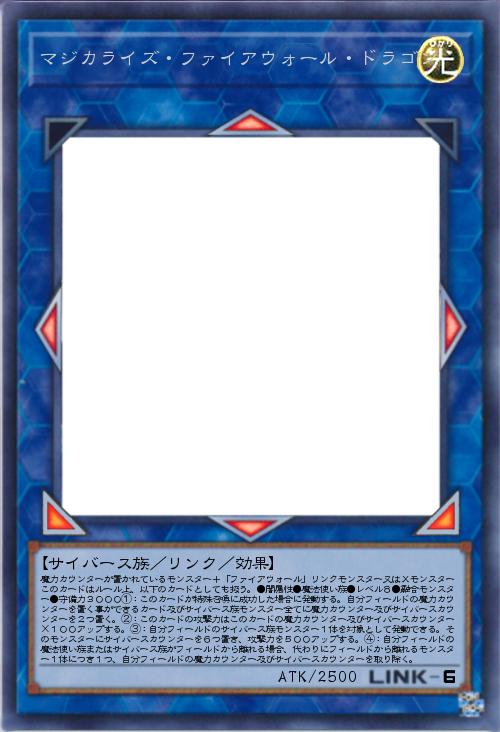 | 魔力カウンターが置かれているモンスター+「ファイアウォール」リンクモンスター又はXモンスター このカードはルール上、以下のカードとしても扱う。●闇属性●魔法使い族●レベル8●融合モンスター●守備力3000①:このカードが特殊召喚に成功した場合に発動する。自分フィールドの魔力カウンターを置く事ができるカード及びサイバース族モンスター全てに魔力カウンター及びサイバースカウンターを2つ置く。②:このカードの攻撃力はこのカードの魔力カウンター及びサイバースカウンター×100アップする。③:自分フィールドのサイバース族モンスター1体を対象として発動できる。そのモンスターにサイバースカウンターを6つ置き、攻撃力を500アップする。④:自分フィールドの魔法使い族またはサイバース族がフィールドから離れる場合、代わりにフィールドから離れるモンスター1体につき1つ、自分フィールドの魔力カウンター及びサイバース | |||