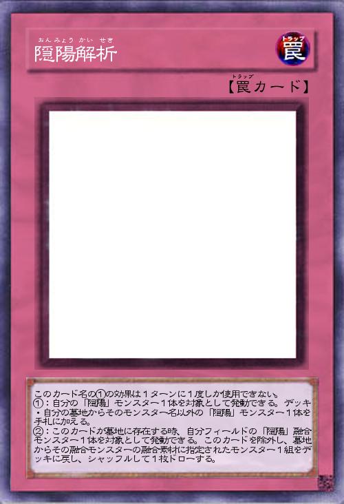 | このカード名の①の効果は1ターンに1度しか使用できない。 ①:自分の「隠陽」モンスター1体を対象として発動できる。デッキ・自分の墓地からそのモンスター名以外の「隠陽」モンスター1体を手札に加える。 ②:このカードが墓地に存在する時、自分フィールドの「隠陽」融合モンスター1体を対象として発動できる。このカードを除外し、墓地からその融合モンスターの融合素材に指定されたモンスター1組をデッキに戻し、シャッフルして1枚ドローする。 | |||