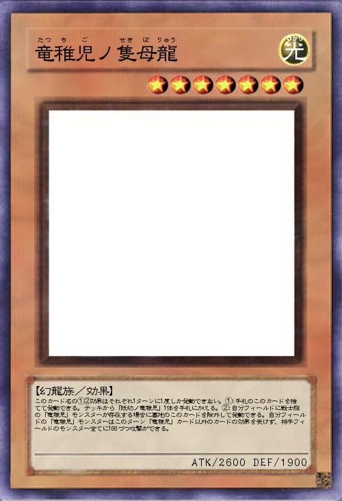 | このカード名の①②効果はそれぞれ1ターンに1度しか発動できない。①:手札のこのカードを捨てて発動できる。デッキから「妖幼ノ竜稚児」1体を手札に加える。②:自分フィールドに戦士族の「竜稚児」モンスターが存在する場合に墓地のこのカードを除外して発動できる。自分フィールドの「竜稚児」モンスターはこのターン「竜稚児」カード以外のカードの効果を受けず、相手フィールドのモンスター全てに1回づつ攻撃ができる。 | |||