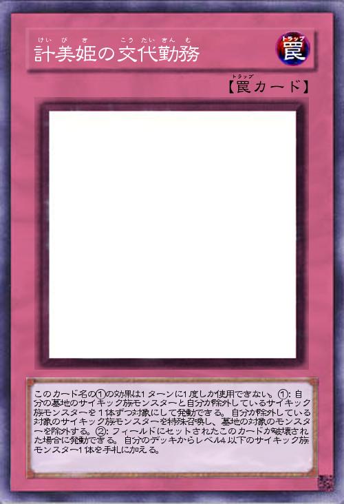 | このカード名の①の効果は1ターンに1度しか使用できない。①:自分の墓地のサイキック族モンスターと自分が除外しているサイキック族モンスターを1体ずつ対象にして発動できる。自分が除外している対象のサイキック族モンスターを特殊召喚し、墓地の対象のモンスターを除外する。②:フィールドにセットされたこのカードが破壊された場合に発動できる。自分のデッキからレベル4以下のサイキック族モンスター1体を手札に加える。 | |||