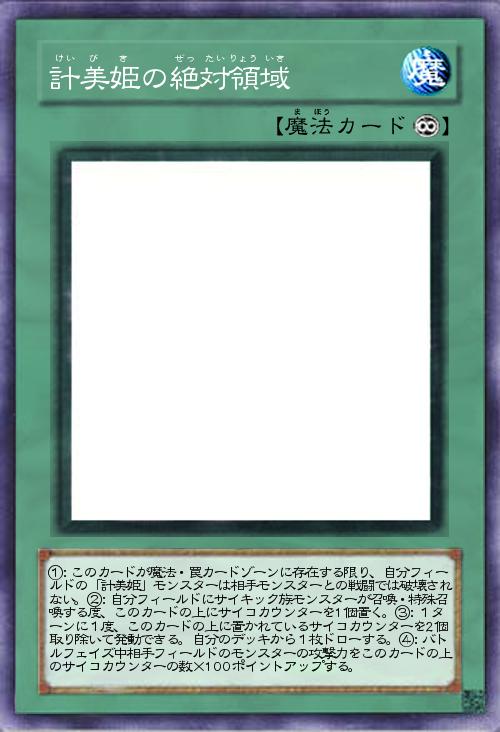 | ①:このカードが魔法・罠カードゾーンに存在する限り、自分フィールドの「計美姫」モンスターは相手モンスターとの戦闘では破壊されない。②:自分フィールドにサイキック族モンスターが召喚・特殊召喚する度、このカードの上にサイコカウンターを1個置く。③:1ターンに1度、このカードの上に置かれているサイコカウンターを2個取り除いて発動できる。自分のデッキから1枚ドローする。④:バトルフェイズ中相手フィールドのモンスターの攻撃力をこのカードの上のサイコカウンターの数×100ポイントアップする。 | |||