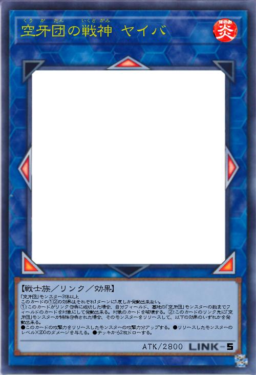 | 「空牙団」モンスター3体以上 このカードの①②の効果はそれぞれ1ターンに1度しか発動出来ない。 ①:このカードがリンク召喚に成功した場合、自分フィールド、墓地の「空牙団」モンスターの数までフィールドのカードを対象にして発動出来る。対象のカードを破壊する。②:このカードのリンク先に「空牙団」モンスターが特殊召喚された場合、そのモンスターをリリースして、以下の効果のいずれかを発動出来る。 ●このカードの攻撃力をリリースしたモンスターの攻撃力分アップする。●リリースしたモンスターのレベル×200のダメージを与える。●デッキから2枚ドローする。 | |||