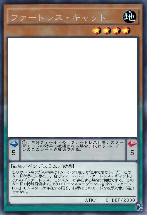 | このカード名に①の効果は1ターンに1度しか使用できない。①:このカードが手札に存在し、自分フィールドに「ファートレス・キャット」以外の「ファートレス」モンスターが存在する場合に発動できる。このカードを特殊召喚する。②:EXモンスターゾーンに自分の「ファートレス」モンスターが存在する限り、相手はこのカードを攻撃対象に選択できない。 | |||