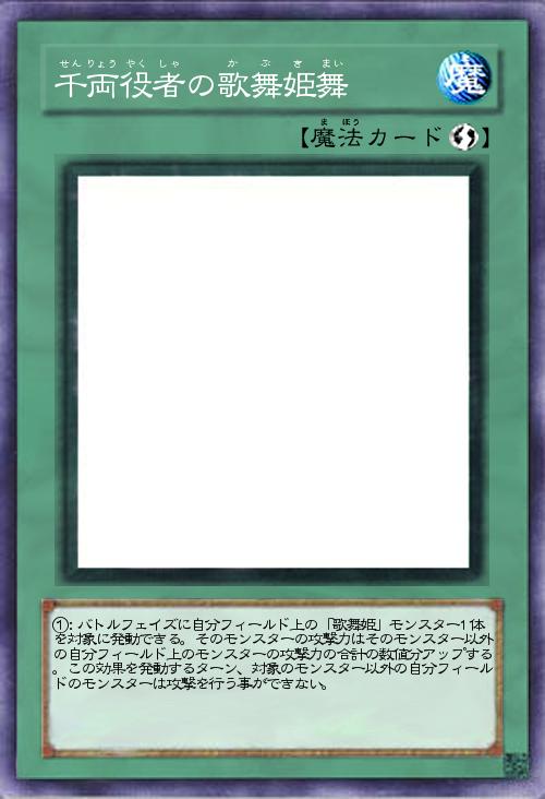 | ①:バトルフェイズに自分フィールド上の「歌舞姫」モンスター1体を対象に発動できる。そのモンスターの攻撃力はそのモンスター以外の自分フィールド上のモンスターの攻撃力の合計の数値分アップする。この効果を発動するターン、対象のモンスター以外の自分フィールドのモンスターは攻撃を行う事ができない。 | |||