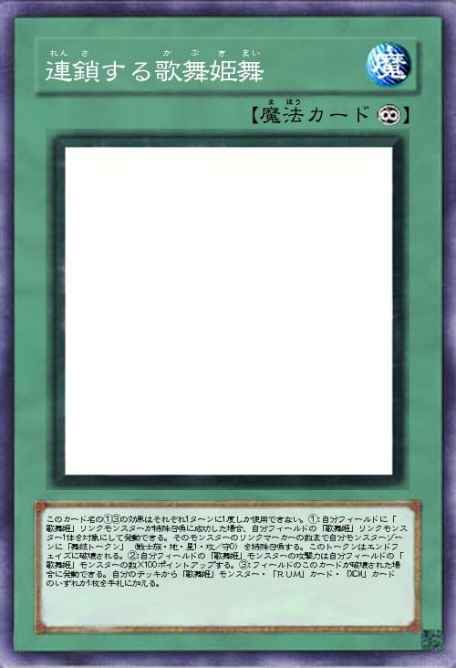 | このカード名の①③の効果はそれぞれ1ターンに1度しか使用できない。①:自分フィールドに「歌舞姫」リンクモンスターが特殊召喚に成功した場合、自分フィールドの「歌舞姫」リンクモンスター1体を対象にして発動できる。そのモンスターのリンクマーカーの数まで自分モンスターゾーンに「舞妓トークン」(戦士族・地・星1・攻/守0)を特殊召喚する。このトークンはエンドフェイズに破壊される。②:自分フィールドの「歌舞姫」モンスターの攻撃力は自分フィールドの「歌舞姫」モンスターの数×100ポイントアップする。③:フィールドのこのカードが破壊された場合に発動できる。自分のデッキから「歌舞姫」モンスター・「RUM」カード・「XCM」カードのいずれか1枚を手札に加える。 | |||