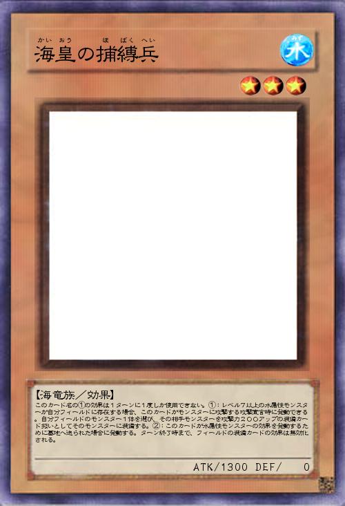 | このカード名の①の効果は1ターンに1度しか使用できない。①:レベル7以上の水属性モンスターが自分フィールドに存在する場合、このカードがモンスターに攻撃する攻撃宣言時に発動できる。自分フィールドのモンスター1体を選び、その相手モンスターを攻撃力200アップの装備カード扱いとしてそのモンスターに装備する。②:このカードが水属性モンスターの効果を発動するために墓地へ送られた場合に発動する。ターン終了時まで、フィールドの装備カードの効果は無効化される。 | |||