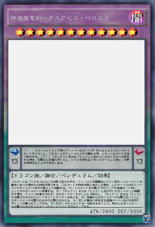 | このカードは「ヘルモスの爪」の効果で自分の手札・フィールドの闇属性ドラゴン族モンスターカードを墓地へ送った場合のみ特殊召喚できる。このカードが特殊召喚に成功した場合、このカード以外のフィールドのモンスター1体を対象として発動する。(1):このカードを攻撃力1500アップの装備カード扱いとしてそのモンスターに装備する。(2):「デュアン」または「ミュウ」と名の付いたモンスターと戦闘する場合、ダメージ計算を行わず、そのモンスターをゲームから除外し、「デュアン」または「ミュウ」の攻撃力の半分のダメージをコントローラーは受ける。(3):装備されたモンスターの攻撃力はバトルしたモンスターの攻撃力の半分の攻撃力を加える。(4):互いの墓地に存在する装備カード一枚に付き800ポイント攻撃力がアップする。(5):EXデッキからカードを一枚除外することで、除外したモンスターの攻撃力の半分をこのターンのエンド | |||