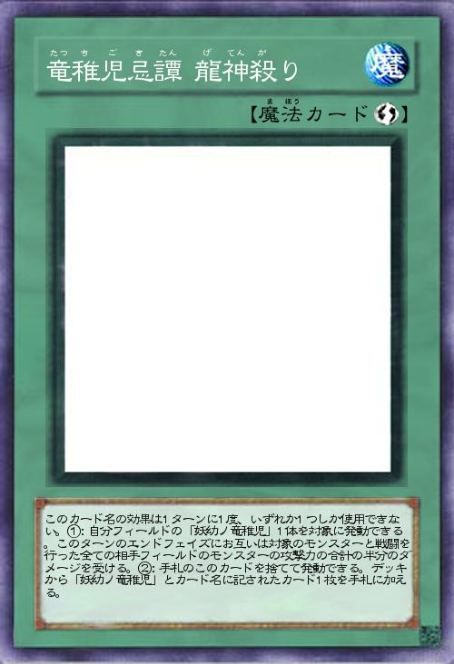 | このカード名の効果は1ターンに1度、いずれか1つしか使用できない。①:自分フィールドの「妖幼ノ竜稚児」1体を対象に発動できる。このターンのエンドフェイズにお互いは対象のモンスターと戦闘を行った全ての相手フィールドのモンスターの攻撃力の合計の半分のダメージを受ける。②:手札のこのカードを捨てて発動できる。デッキから「妖幼ノ竜稚児」とカード名に記されたカード1枚を手札に加える。 | |||